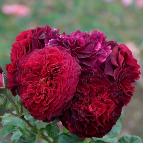 Krūmroze- Franču, bordo, pildīti ,ļoti krokoti ziedi, smaržīga,zied ķekaros, h-1.2m.