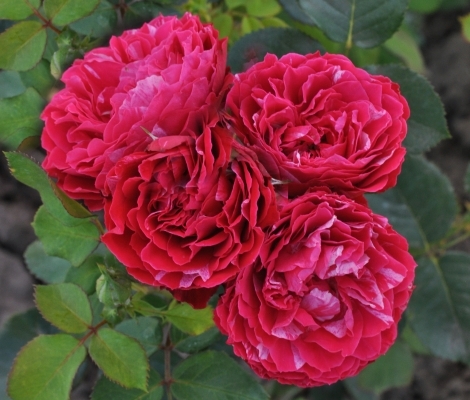 Floribundroze – Blīvi pildītie sarkani ziedi ar baltu svītrojumu, bagātīgi ziedoši. Veseligi krūmi, h-70m.