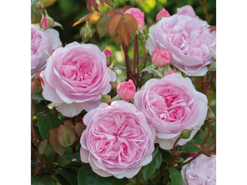 Angļu roze rozā, ar spēcīgu augļu smaržu, spīdīgām lapām, h-1m. Izturīga.